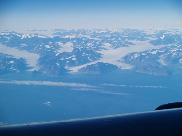Der Flieger stand dann noch so ungefähr eine Stunde rum, weil irgendwas scheinbar repariert werden musste und dann gings los. Der Flug verlief ziemlich problemlos, ab und zu gab es schöne Aussichten aus dem Fenster wie zum Beispiel die als wir gerade Grönland passierten: