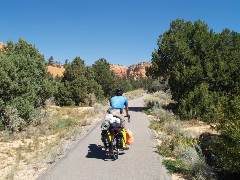 Wir haben uns dann aufs Rad geschwungen und sind zum Bryce Canyon gefahren. Teilweise sind wir auf einem tollen Radweg durch den sogenannten "Red Canyon" gefahren. Kurz bevor wir in den Park rein sind haben wir in einem überteuertem Touristenladen noch ein paar Sachen fürs Abendessen eingekauft wo sich ein ganzer Bus voll Franzosen sich sehr für unsere Räder interessierten die wir vor dem Laden abgestellt hatten.