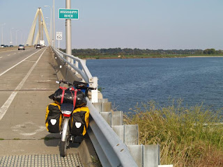 Der Trail wurde dann auch etwas interessanter, da er so langsam durch die Vororte von St.Louis verlief. Er endet dann mitten im Nichts nördlich von St.Louis. Man muss dann ein paar Nebenstraßen nehmen und landet dann bei der Brücke, die einen über den Mississippi bringt. Der Fluss ist hier aber noch gar nicht sooo wahnsinnig breit. Der Zeit nach zu urteilen, die ich benötigte über die Brücke zu fahren, könnte ich jetzt nicht mit Bestimmheit sagen, dass er breiter als der Rhein ist.